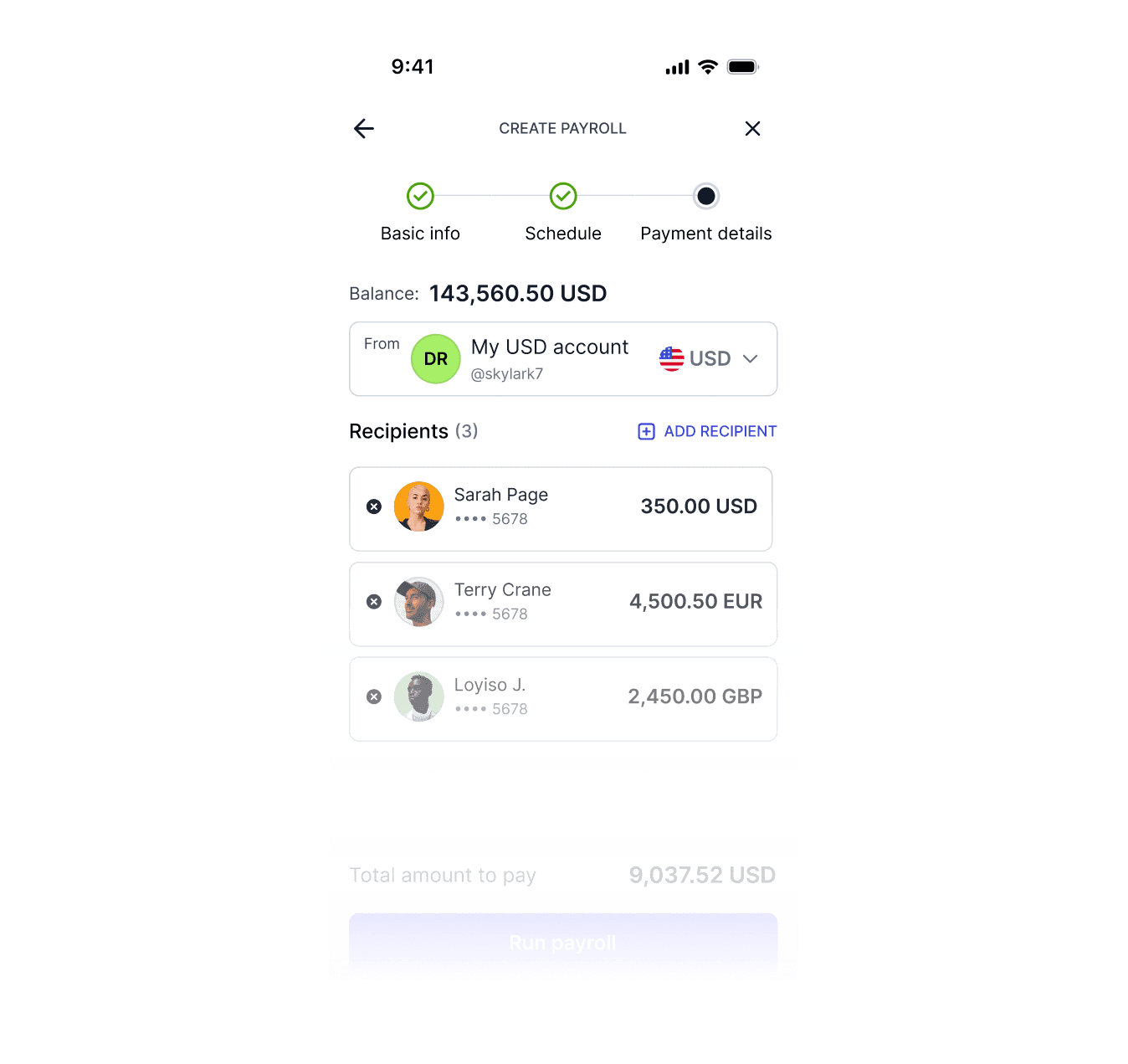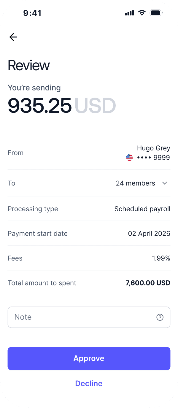 Pay domestic and international teams from one account. Send payroll in USD, EUR, GBP or CHF while we handle the cross-border payments so your team are paid instantly.
